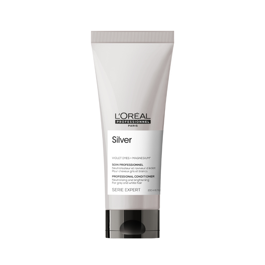 El acondicionador Silver de Loreal para cabello blanco o gris de la serie Silver cuenta con micro pigmentos violetas y azules para neutralizar los tonos amarillos.Proporciona suavidad y brillo